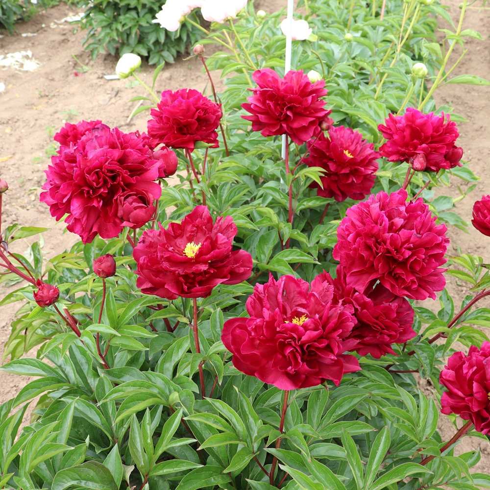 Burma. Lins. 1945. Lactiflora cultivar. Seedling#: R-7 X D R. A large, beautifully formed, beautiful red, with impeccable flower carriage. Burma has excellent form, heavy substance, good stems that hold the blooms erect, and does not burn in the sun. Plants are of medium height. Typically one bud per stem, but may have a side bud or two. Stems are red and contrast with the foliage perfectly. An outstanding variety. Premium divisions ship late September to mid-October.