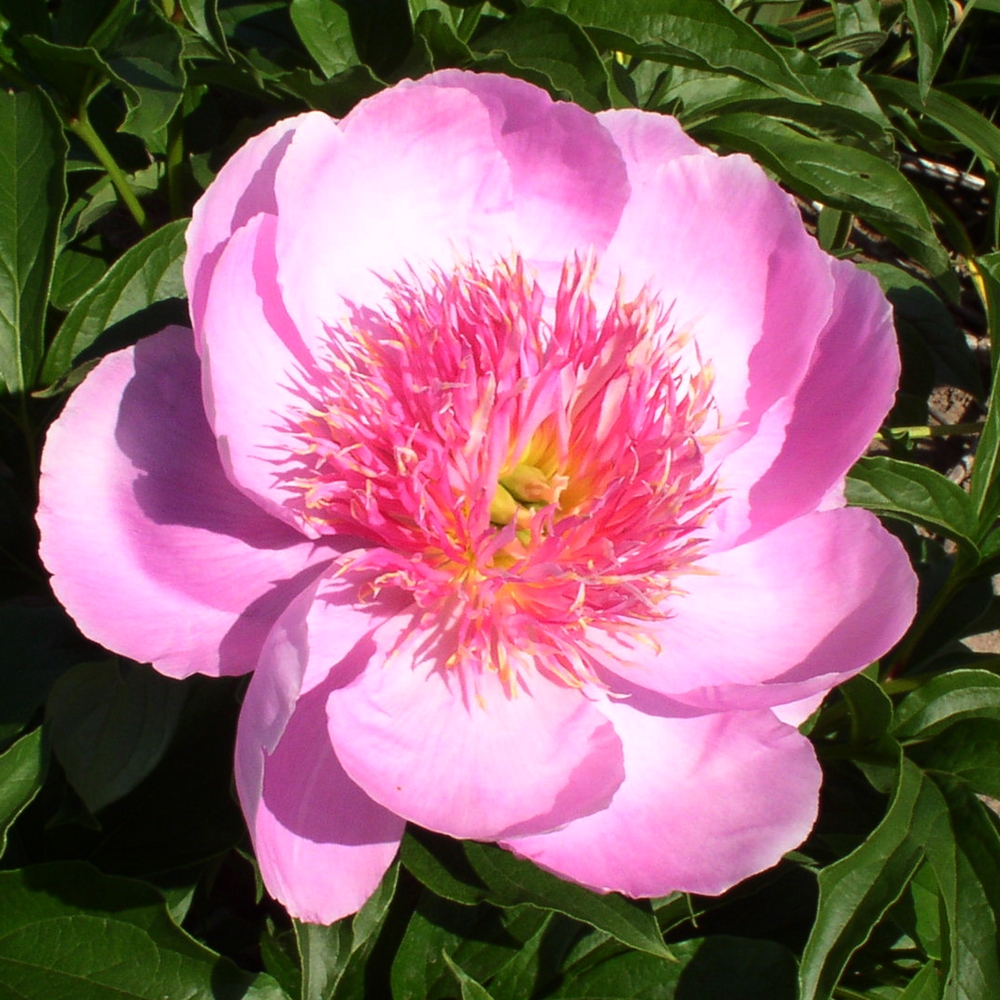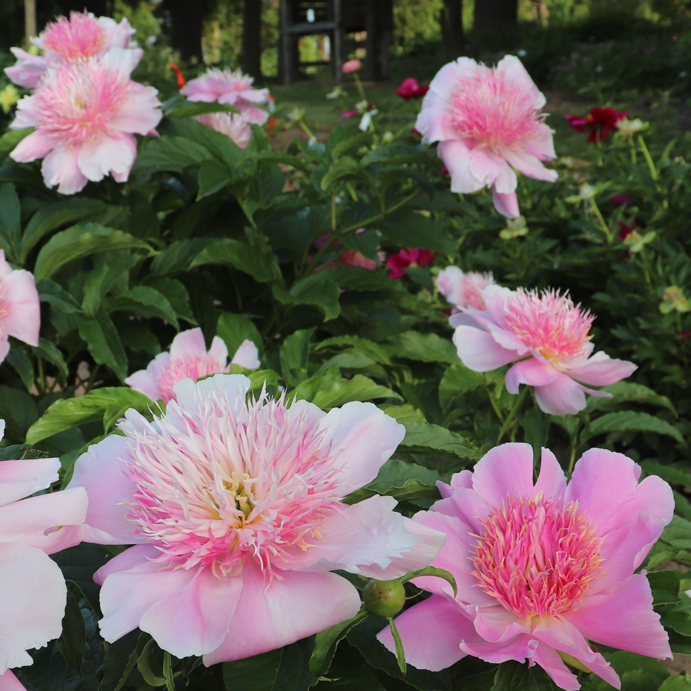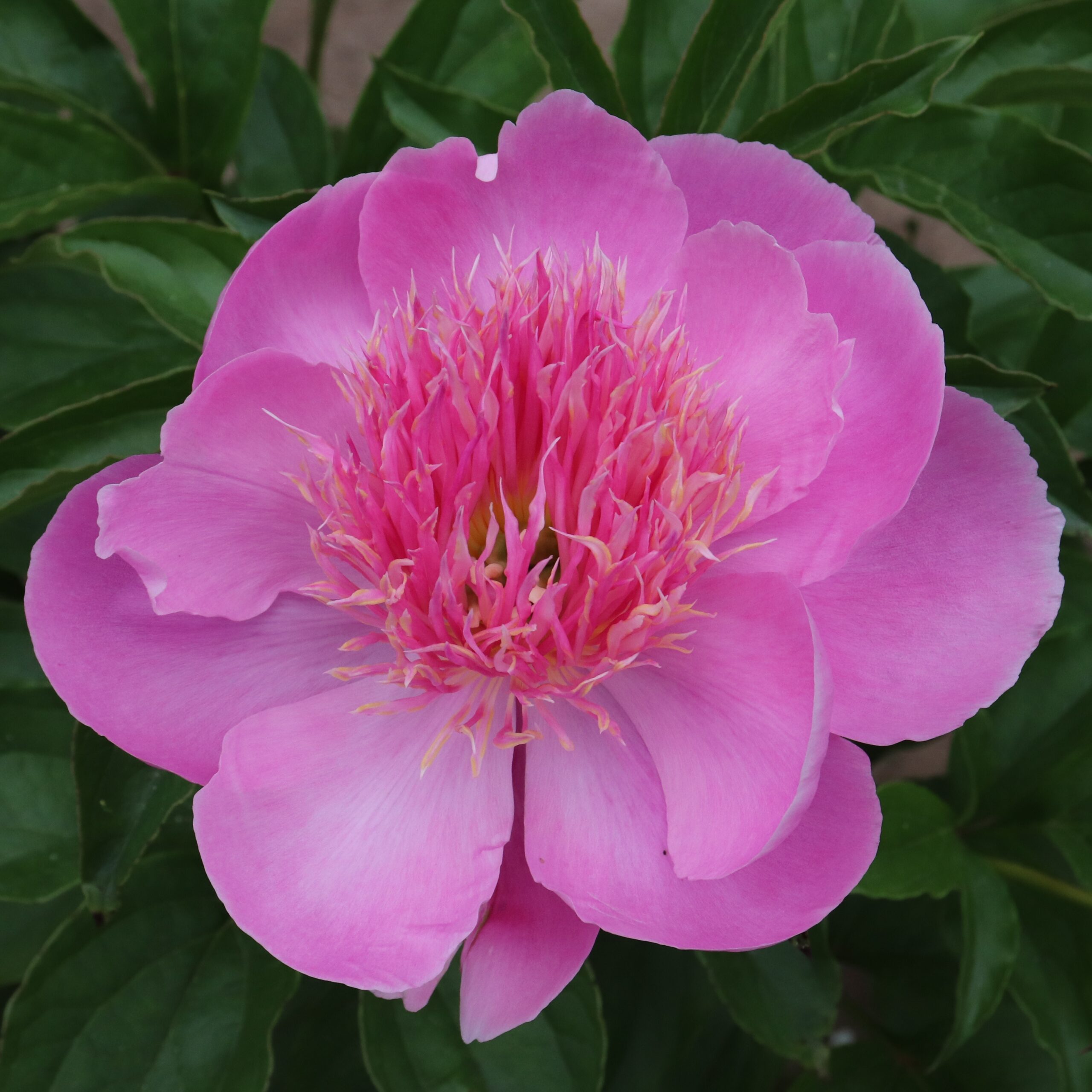 Fancy Nancy. Auten. 1944. Lactiflora cultivar. The Japanese form flowers are a soft cerise pink. Flowers are a uniform coloration throughout. Excellent carriage and flowers are held upright. Week 5 bloom time. Approximately 27″ in height. Foliage is large and deep green. Seed fertility, no pollen. Premium divisions ship late September to mid-October.