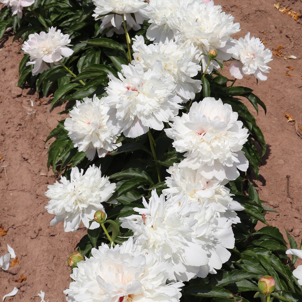 Madame Calot. Miellez. 1856. Lactiflora cultivar. The large double flowers are a very light old rose pink with creamy tints upon opening. Flowers expand and fade to white. Stout plants hold the many flowers upright. Floriferous. Foliage is deep green and healthy. A variety of considerable popularity because of its earliness, unfailing productiveness, and the general high quality of its blooms. Premium divisions ship late September to mid-October.