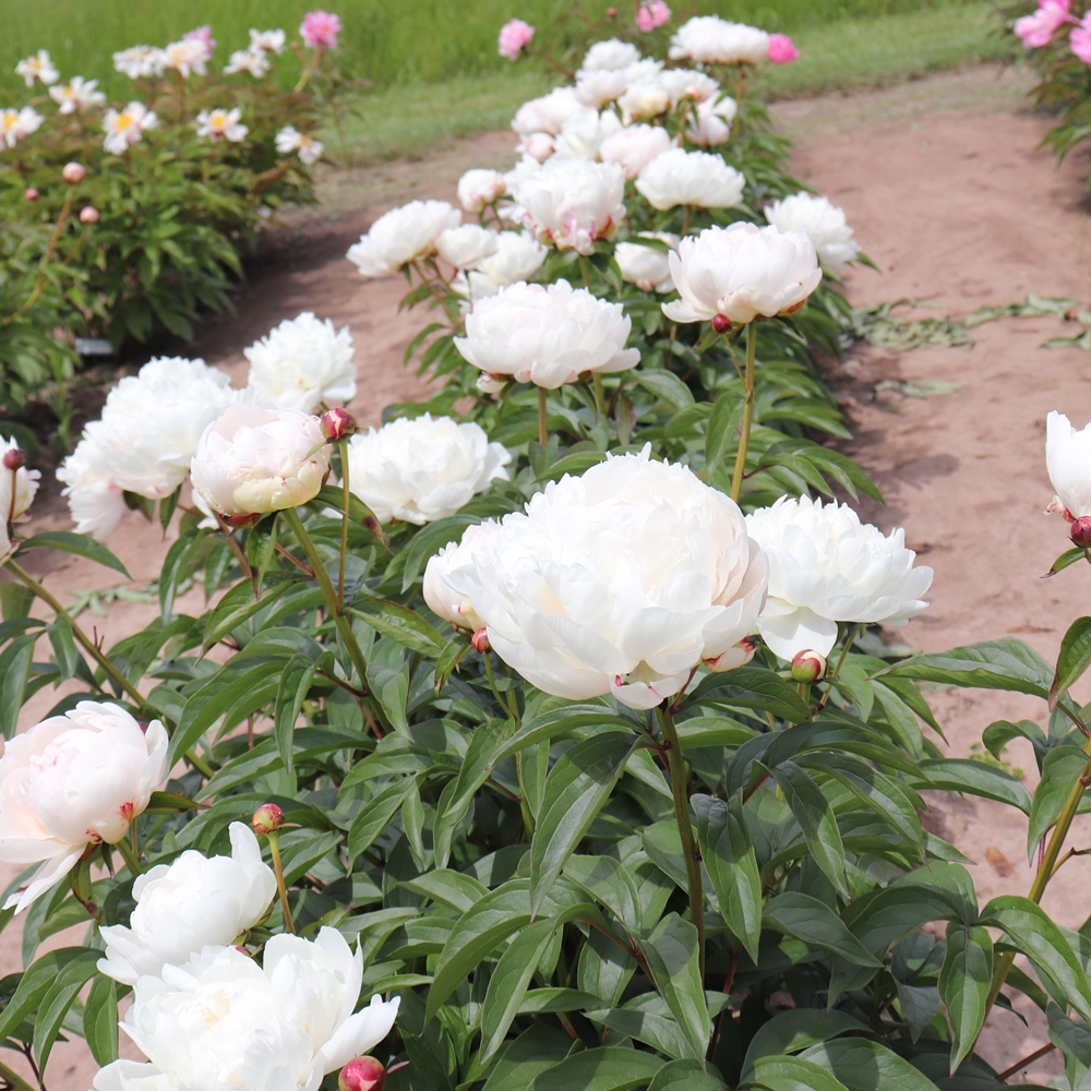 Mercedes. Lins. 1956. Lactiflora cultivar. Flowers are large, fully double, blush pink at opening, later white. Good stems and foliage, heavy substance, but plants look best with mechanical support. Many side buds. Opens late midseason. Seedling #: M-L-96-B. Very dependable and a much sought-after Lins cultivar for cut flower purposes. Superior. Premium divisions ship late September to mid-October.