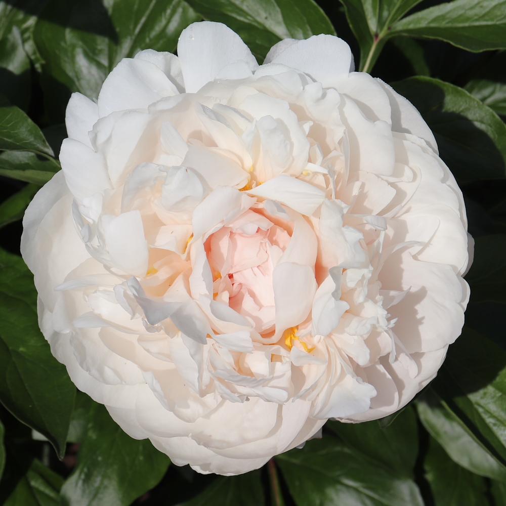 Origin of Serenity. Bremer. 2019. Advanced generation herbaceous hybrid. Parentage: (Manitowoc Maiden x Pastelegance). Large double white flowers with champagne-pink petal bases, creating an inner glow. Good bud covers allow flowers to open without early water damage. The double flowers have ruffled and notched petals. Flowers open in organized petal layers, often with a small ball of petals at the center, which encloses the anthers and stigmas. Stigmas are often abortive, but may be intact on some flowers. Stigmas are light pink-green and are not visible without assistance. Incomplete, nearly unidentifiable cream disc. Foliage is deep green and wide. Leaves are widely spaced on sturdy stems. Plants lean when in flower, but mechanical support is not needed for good flower presentation here in Wisconsin. A healthy, growing hybrid that shows an average increase. Excellent in a clump and one of the most admired selections among our large collection of herbaceous peonies. Premium divisions ship late September to mid-October.