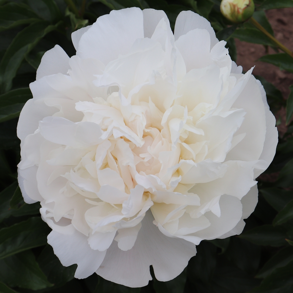 Ramona Lins.  Lins.  1942. Full double flower of perfect form and outstanding color. The large ornamental double flowers are blush at opening and fade to near white.  Very reliable performer. The strong stems hold the large blooms erect, requiring no mechanical assistance. 3-year-old plants are 38 inches high. Dark green foliage all the way down. Medium late bloomer. Rare and in high demand.  Seedling #: S-l-4. Premium divisions ship from late September to mid-October.