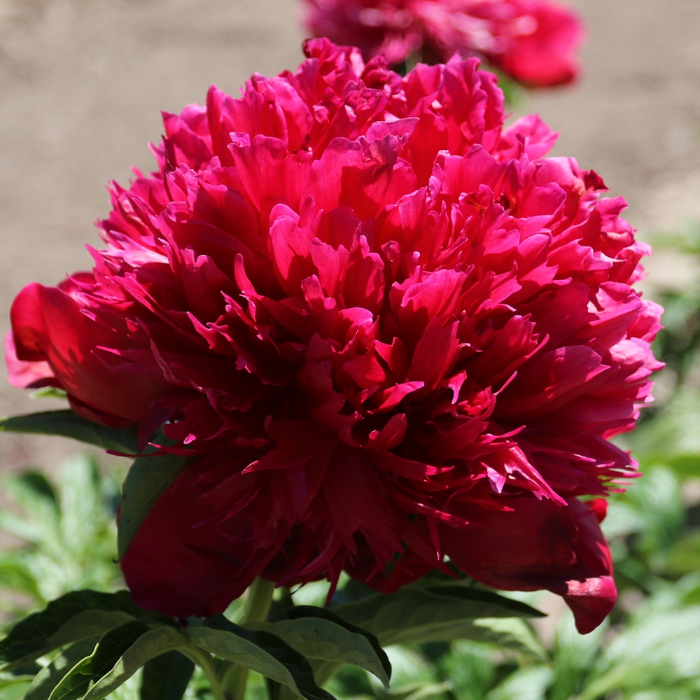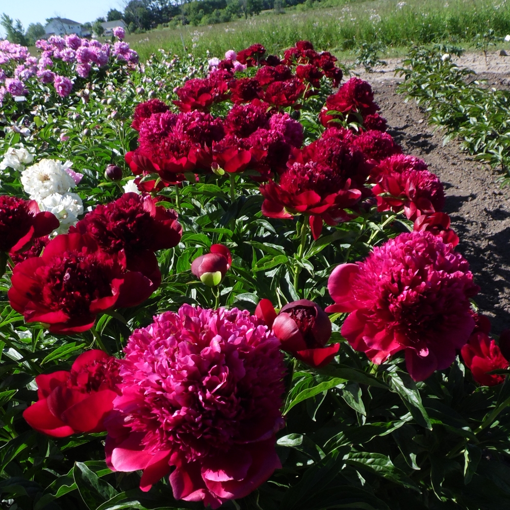 Red Charm.  Glasscock.  1944.  Herbaceous hybrid.  1956 American Peony Society Gold Medal winner.  APS ‘Best In Show’-1951, 1965.  Red Charm is a huge double red.  Flowers are stunning due to the color saturation, number of petals, and size.  The texture of the flower is that of plastic.  The 36″ stems are strong and hold the large blooms erect, for the most part.  Foliage is deep green and healthy, but may begin to show wear and tear late in the season. Red Charm is one of the more popular modern hybrids and should definitely get consideration by anyone who wants to grow peonies.  We’ve not seen seed, but others report production. Week 4-5 bloom time. (lactiflora x officials). Premium divisions ship from late September to mid-October.