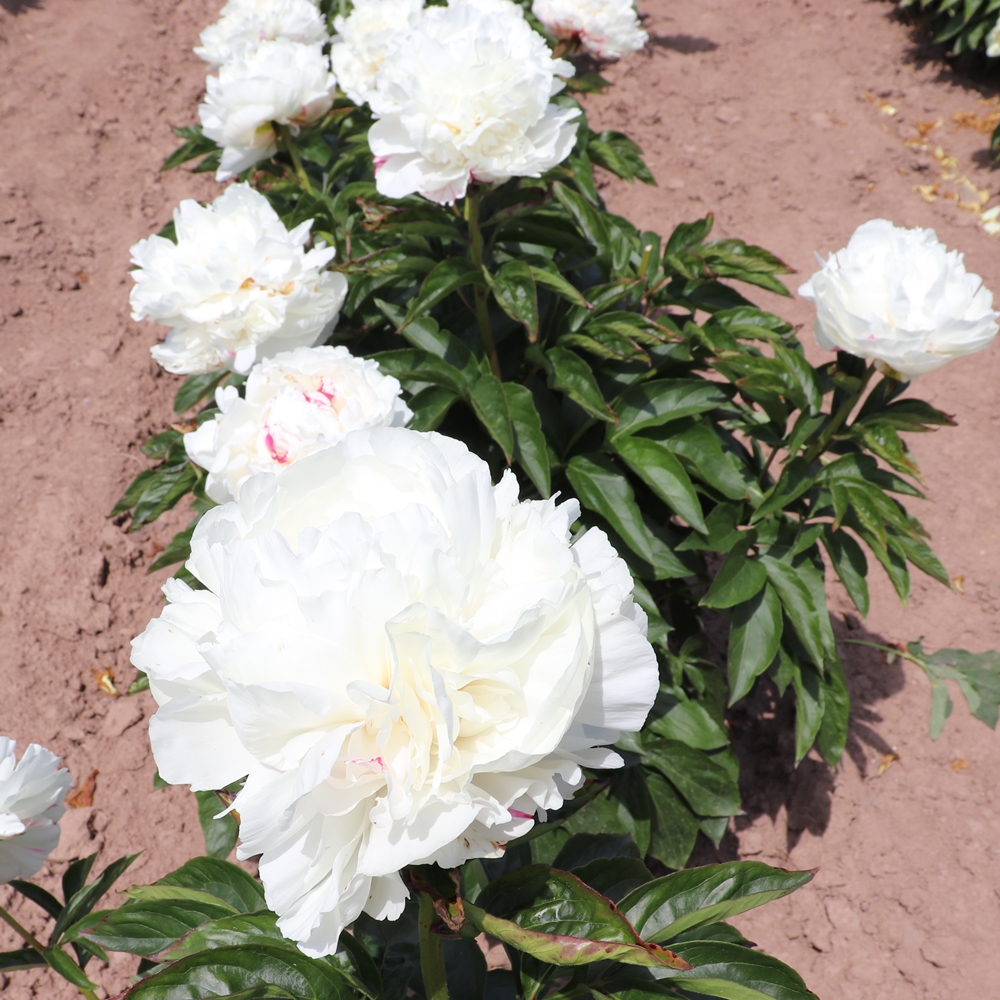 Silver Slippers.  Klehm.  Lactiflora cultivar.  High crowned double, silver white. 3 buds per stem, reliable, good substance, has seeds. 32 inches in height with good stem strength. Some red candy streaks on the buds, smooth guard petals. No support required.  Excellent. Seedling #: K53-149. Premium divisions ship from late September to mid-October.
