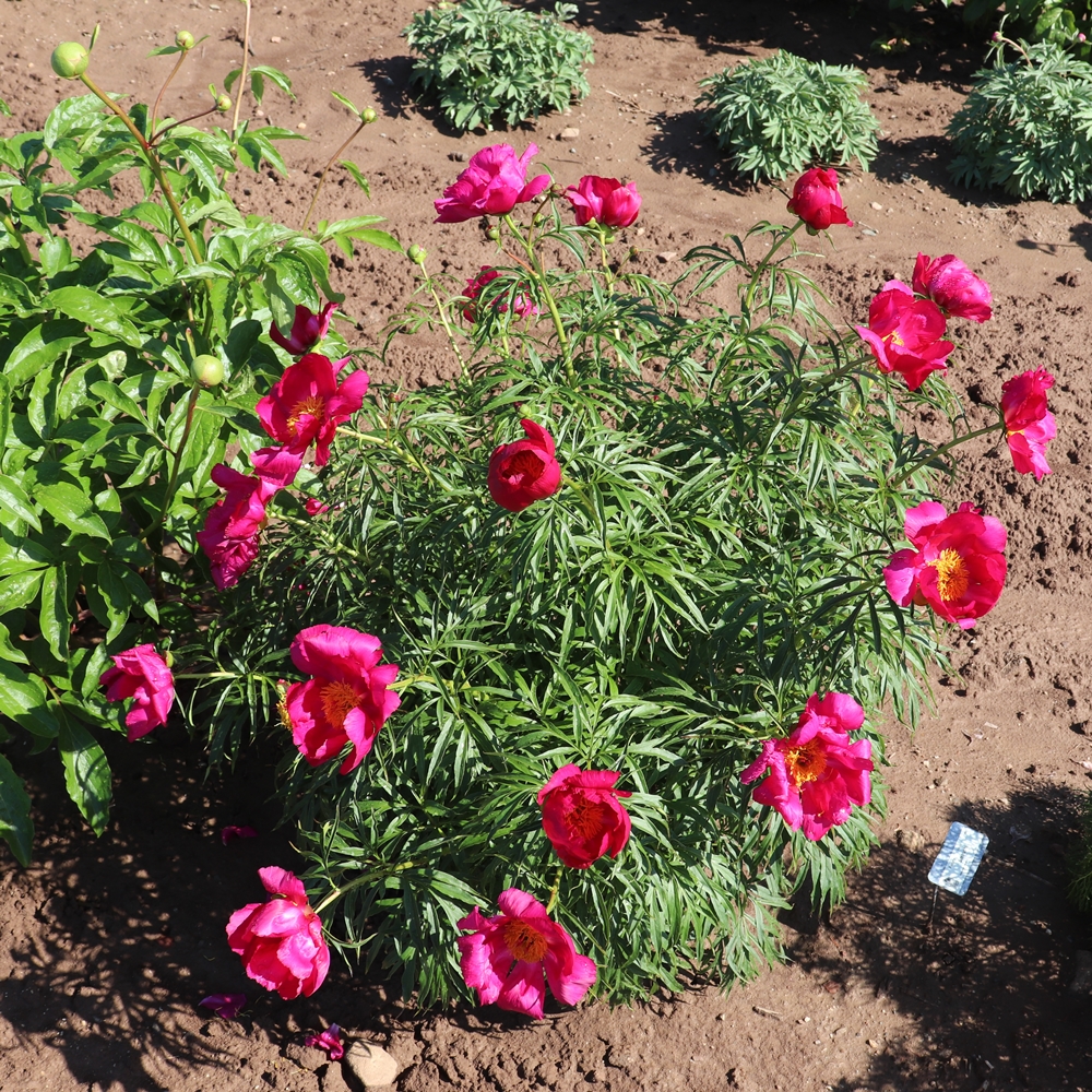 Smoutii (Smouthi). The name and description were first published in 1843 (L’Horticulteur universel: journal général des jardiniers et des amateurs, Vol. 4, page 274 (1843)). A hybrid of Paeonia albiflora and P. tenuifolia. Satiny, bright dark cherry color and has beautiful, deep cut foliage (coarse fern leaf). A very old historic hybrid often incorrectly sold as P. tenuifolia. Premium divisions ship from late September to mid-October.