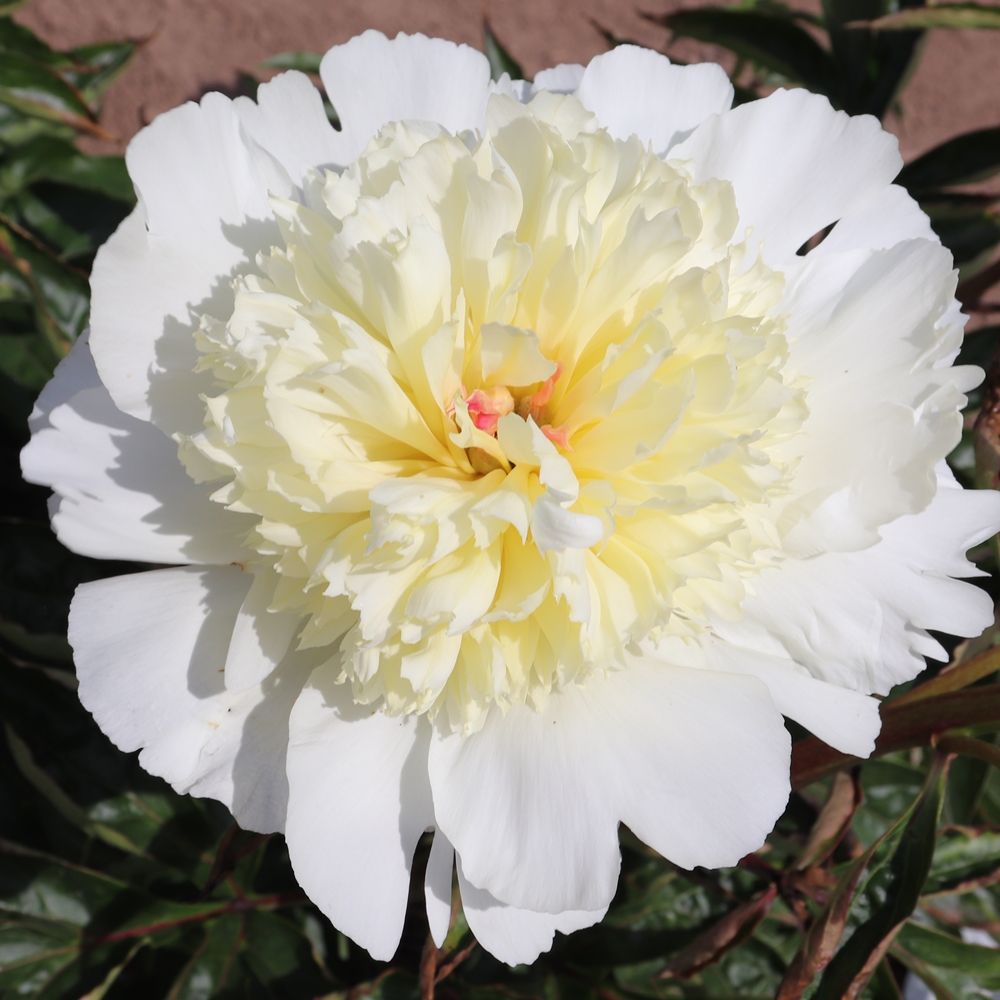 Vanilla, One Scoop. Klehm. 2010. Lactiflora Group. Seedling #: K53-6D. Flowers open as an anemone form and later become bombs. BOMB. Vanilla white petals with soft cream petalodes. Average of three blooms per stem, 5-5 ½ inches in size. Rose stigmas, normal anatomy. Fragrant. Short sturdy plant, 18 inches in height, green, broad, pointed foliage. Does not need support, good garden and landscape potential. Excellent and not previously well distributed. Premium divisions ship from late September to mid-October.