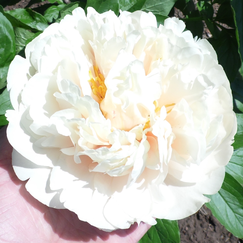 White Vanguard.  Seidl/Chotkowski.  2020.  Herbaceous Hybrid.  Seedling #: Seidl 79H14-1. Parentage: (Archangel x Blushing Princess).  Semi-double to double flowers on mature plants, buff with pink tints on opening, then fading to white. Medium-sized blooms, moderately deep, becoming more rounded and deeper as the flower matures, with visual bulk being added to the flower by means of petals being gently ruffled, subtly crinkled, and held increasingly far apart. Tufts of thin petalodes emerge through the stamen boss and increase with plant maturity. Petals of average substance. Thick stamens are borne on short filaments. Ghost green carpels are tipped with dark red (mahogany) stigmas. Fertile both ways. Light sweet fragrance, rare for hybrids of this type of parentage. Vigorous when well grown, having rapid stem increase. Semi-shiny leaves are medium-sized atop the bush, becoming much larger lower down on the stem, reflecting its macrophylla heritage. Stems of medium thickness project upward and slightly outward. Foliage almost to the ground with stem “legs” well hidden. Height at maturity is 30 inches with a 36-inch spread.  Highly desirable plant for hybridizing.  Plants require well-drained soil and resent heavy clay soil.  Premium divisions ship from late September to mid-October.