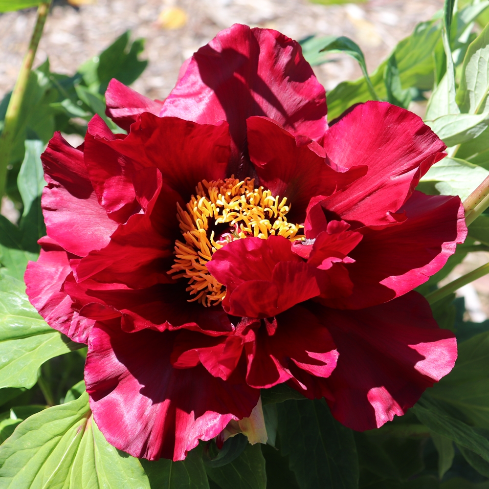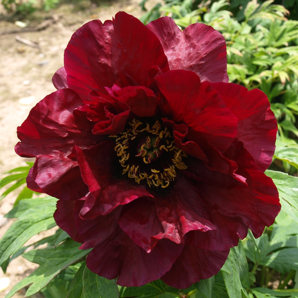 Black Pirate. Saunders. 1935. F1 generation lutea hybrid. 3-4 rows of huge dark red satiny petals. Flares are “black” and wide. Filaments are very dark. Stigmas bright pink; sheath lilac. Only rare side-buds. Flowers are very dark and have a shiny sheen to them. Wide, deep green foliage. Excellent. Not a vigorous plant for us, but worth growing for its stunning flowers. Stems lack winter hardiness, but produce basal shoots that bloom reliably. No fertility. Rarely available. Black Pirate is quite rare in commerce and is highly sought after by collectors or someone who wants something different in their garden. Ships in late September to mid-October. AGE: Field-grown, 3+ year old graft or division from larger plants – our choice of available plant material upon harvest.