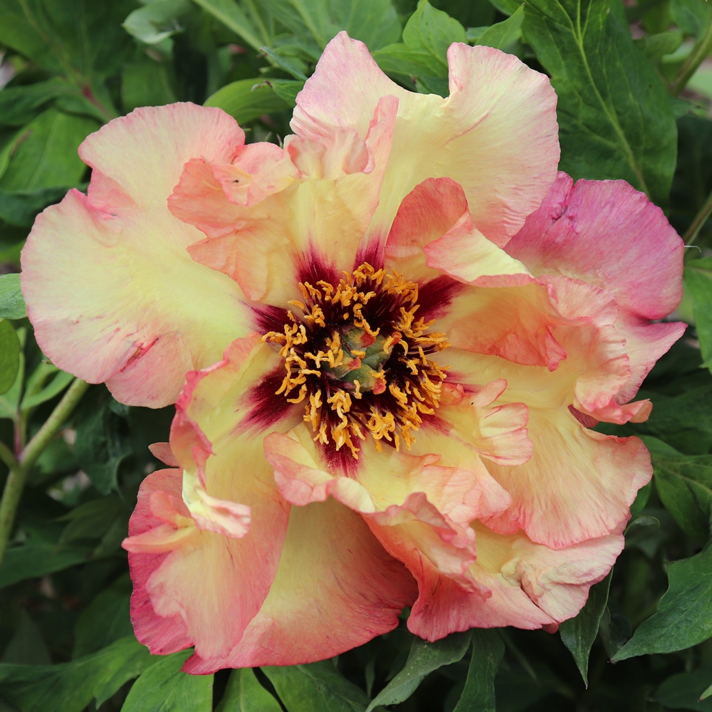Caroline Bay. Irvine/Sutherland. 2001. Advanced generation lutea hybrid. Seedling #233/2. Parentage: Seidl #21 x unknown. Deep reddish-pink semi-double flowers upon opening, with short maroon flares. Flowers later fade to reveal a light cream-yellow base that is infused with rosy-pink highlights. Stigmas are red. Some flower color variation has been noted, with an attractive bright cream-yellow and pink picotee variant being most common (excellent – see gallery). Good flower carriage. Foliage is a healthy medium green. Nicely ruffled and rounded petals create an overall round flower. From Bill Seidl seed that was sent to New Zealand in the 1990s. Ships in late September to mid-October. AGE: Field-grown, 3+ year old graft or division from larger plants – our choice of available plant material upon harvest.
