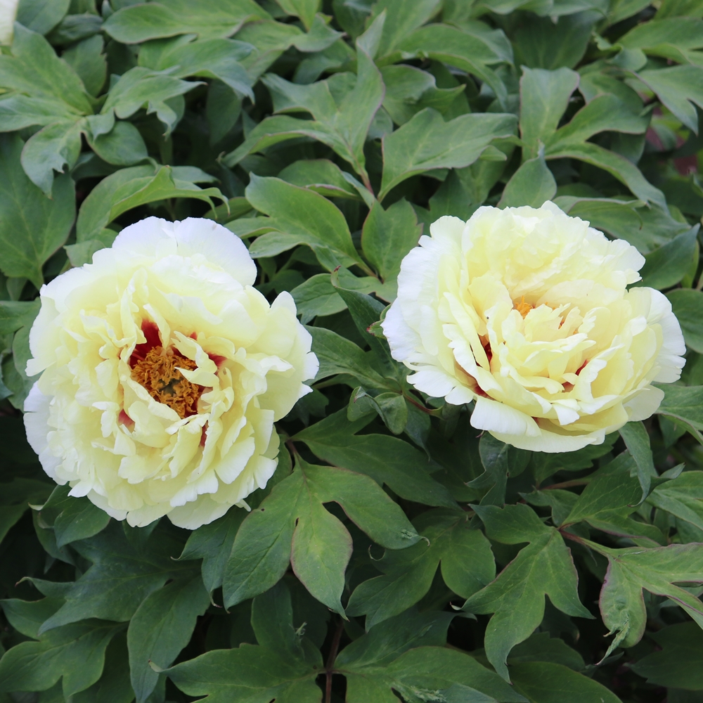 Oukan. Jessel. Registered in Japan. Lutea hybrid. Large yellow, many-petaled, semi-double yellow with maroon flares. Parentage: (High Noon x Shinfuso). This cross is a Lutea Hybrid backcrossed to a Japanese Suffruticosa cultivar. Superior to High Noon for plant habit and floral display. The flower carriage is upright, and plants produce abundant blooms. Excellent and deserves to be grown more widely. Foliage is heavy and is carried on thick stems. The cultivar Oukan was registered through the Japanese cultivar database by Walter H Jessel, Jr, 515 C. Chardonnay Drive, Gonzales, California, USA. Fertility is unknown at this time. Ships in late September to mid-October. AGE: Field-grown, 3+ year old graft or division from larger plants – our choice of available plant material upon harvest.