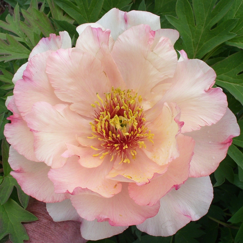 Peach Festival. Seidl/Bremer. Advanced generation lutea hybrid. (Brassy Lady x #65). #65=Daphnis #223 x Zephyrus. Large cream and peach single to semi-double flowers are carried on long stems. Red stamens, cream stigmas, and a sheath. Petals are notched at the center. Foliage is beautiful and deep blue-green. Produces long stems that often freeze back during winter, but it produces good ground growth that blooms yearly. A second flush of flowers is carried on very long stems, a couple of weeks after the first blooms. Plants easily reach 4 feet in Wisconsin and perhaps more if winter temperatures do not kill stems. Late emergence and growth in spring avoids frost damage to plants. Foliage is deeply dissected with narrow lobes and more rounded ends than typical. Foliage is somewhat glaucous. Fertile both ways. Distributed earlier under the seedling number and ‘Peach Festival’. Excellent. Ships in late September to mid-October. AGE: Field-grown, 3+ year old graft or division from larger plants – our choice of available plant material upon harvest.