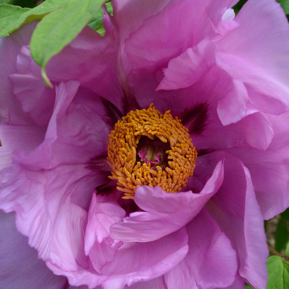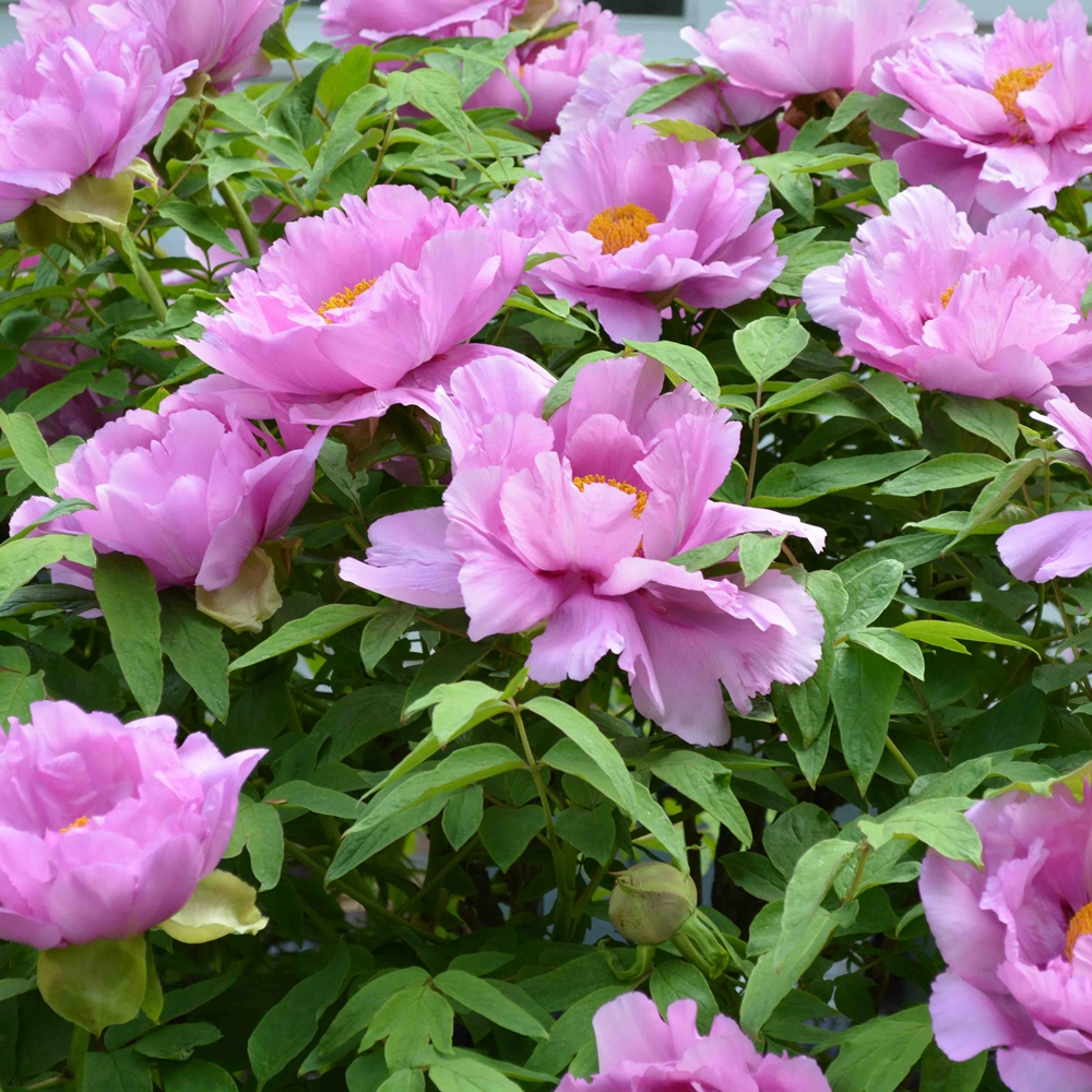 Seneca Hill Pink. Girton. 2023. Rockii/Suffruticosa Group Hybrid. Fertile both ways. Parentage unknown. Early-blooming, semi-double flowers are an unusual lavender-pink, 17.7 cm (7″) in diameter, upward-facing, and average one per stem. Reddish-purple flares with blurred edges extend approximately 25% of the total petal length. Guard petals are rounded and notched, typically 7.6 cm (3″) in diameter. Faint fragrance. The sheath is partial and pink. Produces pollen in abundance and is also seed-fertile. Plants reach 145 cm (57″) at maturity and carry narrow, pointed, green foliage with purple margins. Growth habit is upright; mechanical support is unnecessary, and the mature plant develops an attractive, vase-like shape. Extremely vigorous and hardy, the plant has rarely experienced stem loss during winter dormancy. The height, floriferous habit, and overall shape make it stand out in the garden landscape. Likely not derived from wild-collected Paeonia rockii seed, as registration indicates, given the obvious Suffruticosa Group traits. An outstanding plant in any case. This plant requires very good drainage and resents excessive moisture. Ships in late September to mid-October. AGE: Field-grown, 3+ year old graft or division from larger plants – our choice of available plant material upon harvest.