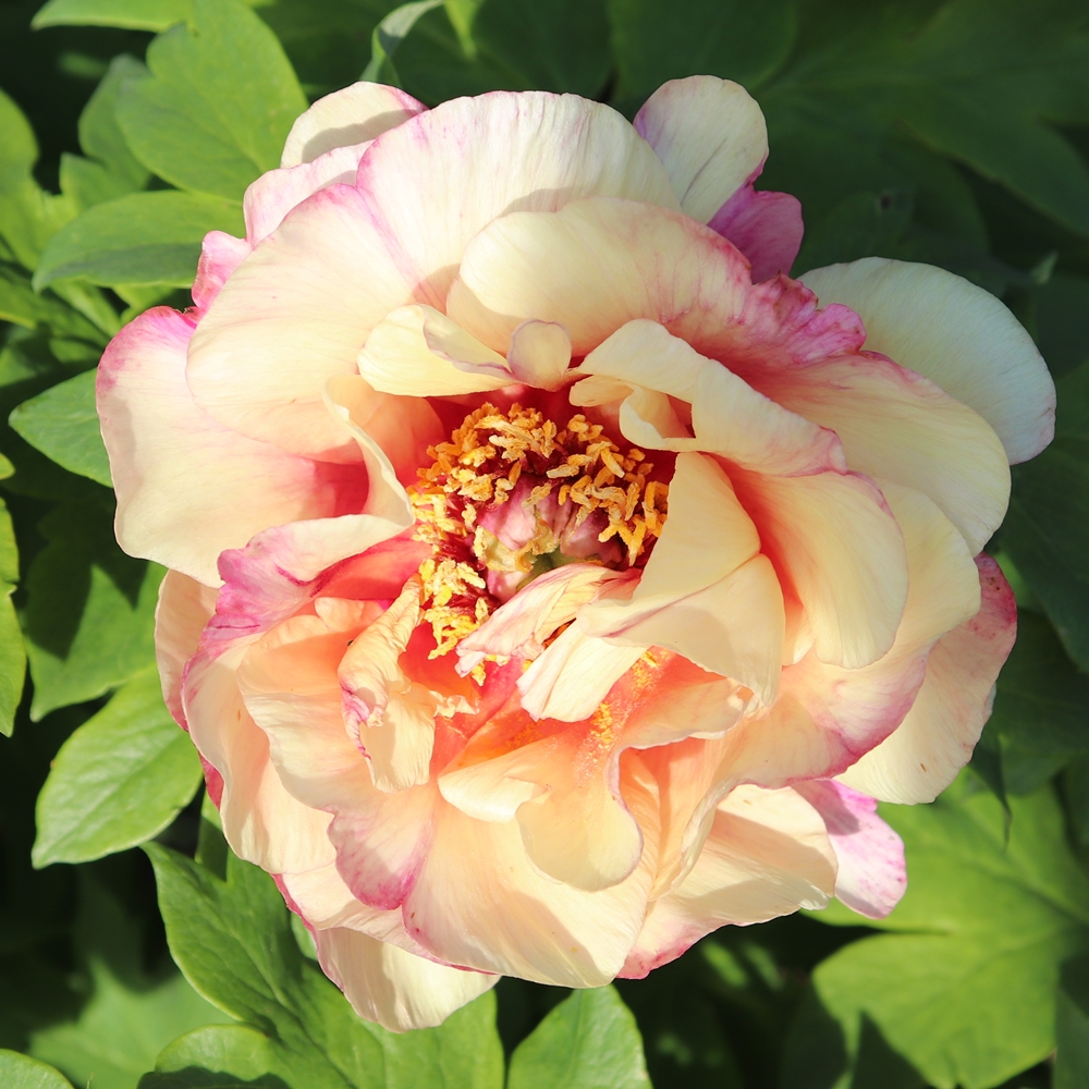 Wellwisher.  Irvine/Sutherland. 2001.  Advanced generation lutea hybrid. Seedling #: 111/7. Grown from seed produced from Bill Seid’s Lutea Hybrid hybridizing program and selected in New Zealand. The large semi-double flowers are creamy-yellow, overlaid with red and pink. Brushed flares are light pinkish-red.  Plants exhibit strong stems that are very hardy to changing winter conditions.  To 4 feet in height by 3 feet in width (Wisconsin).   Foliage is large, waxy and stiff.  Parentage: (SH35 x ‘Autumn Harvest’), SH35 is Golden Era x Chinese Dragon. Ships in late September to mid-October.  AGE: Field-grown, 3+ year old graft or division from larger plants – our choice of available plant material upon harvest.