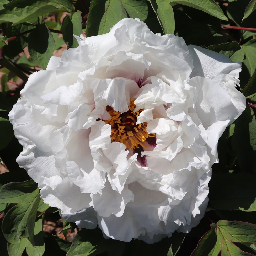 White Empress. Irvine/Sutherland. 2001. Rockii x suffruticosa lineage hybrid. Grown from seed produced from Bill Seid’s hybridizing program and selected in New Zealand. The large vivid white flowers exhibit purple flares on ruffled petals. Strong-growing plants produce heavy woody stems. To 4 feet in height and width. Seedling # 250/1. Parentage: (Godaisho x Lavender Hill). Ships in late September to mid-October. AGE: Field-grown, 3+ year old graft or division from larger plants – our choice of available plant material upon harvest.